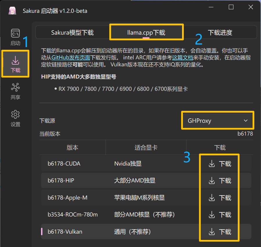 - 查看下方的说明 ,选择合适的版本下载。你可以更换下载源(GHProxy/GitHub),你也可以自行下载,将压缩包内的等多个文件和文件夹解压至对应文件夹(D:\Sakura Launcher\)中